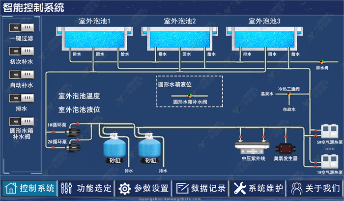 温泉供水系统是针对温泉项目中,泡池的供水需求而设计的成套智能控制系统。温泉供水系统也可称为温泉供水控制系统、温泉水处控制系统、温泉智能控制系统等。主要对温泉项目中的过滤循环水泵、砂缸过滤器、消毒设备、恒温设备、补水/排水阀门以及水下灯等进行控制。实现设备的自动化运行。